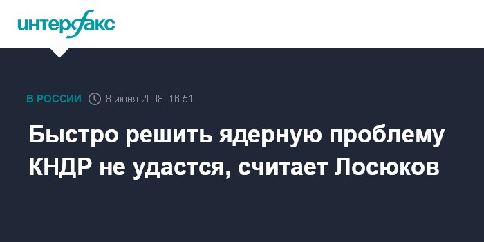Санкт-Петербург. 8 июня. ИНТЕРФАКС - Замгендиректора "Роснанотеха" Александр Лосюков, в недавнем прошлом занимавший пост замглавы российского МИД, не видит предпосылок для скорого разрешения северокорейской ядерной проблемы в рамках шестисторонних переговоров.