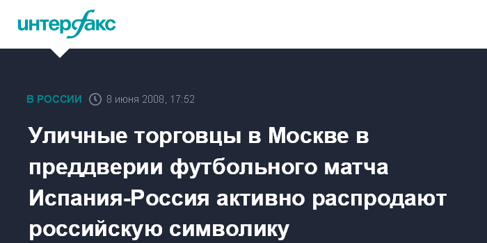 Москва. 8 июня. ИНТЕРФАКС-МОСКВА - Стартовавший в субботу в Австрии и Швейцарии чемпионат Европы по футболу подстегнул активность торговцев российской символики на улицах Москвы.