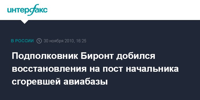 Москва. 30 ноября. ИНТЕРФАКС - Люберецкий гарнизонный военный суд признал незаконным увольнение с должности подполковника Виктора Биронта, который раньше занимал пост начальника 25-й центральной авиационно-технической базы морской авиации ВМФ под Коломной, сильно пострадавшей в результате пожара минувшим летом.