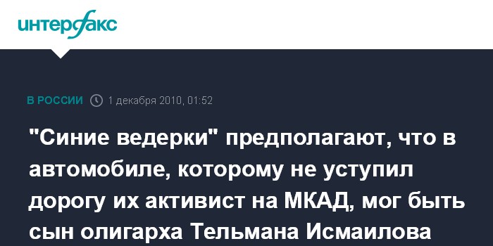 Москва. 1 декабря. ИНТЕРФАКС - В обществе "Синие ведерки" (ОСВ) считают, что мужчины, напавшие на автомобиль москвича, не уступившего дорогу VIP-машине на МКАД, могут быть телохранителями бывшего владельца группы компаний "АСТ" (Черкизовского рынка) Тельмана Исмаилова.