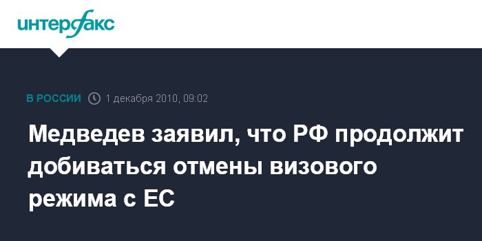 Астана. 1 декабря. INTERFAX.RU - Визовый вопрос - достаточно большая проблема в отношениях России и Евросоюза, считает президент РФ Дмитрий Медведев.