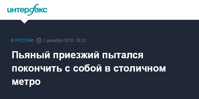 Москва. 1 декабря. INTERFAX.RU - Нетрезвый мужчина попытался свести счеты с жизнью, бросившись под поезд в московском метро, сообщил "Интерфаксу" источник в правоохранительных органах в среду.