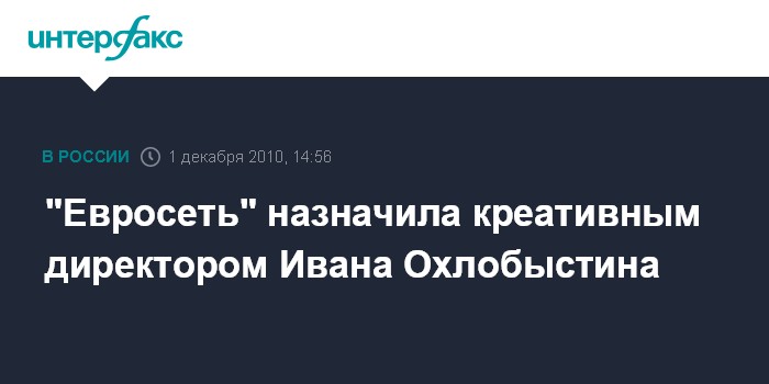 Москва. 1 декабря. INTERFAX.RU - Крупнейший российский сотовый ритейлер "Евросеть" назначил креативным директором актера и режиссера Ивана Охлобыстина, говорится в сообщении компании.