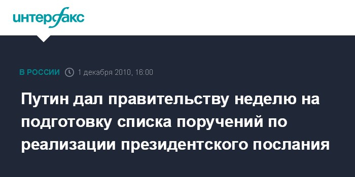 Москва. 1 декабря. INTERFAX.RU - Аппарат правительства в течение недели должен организовать подготовку перечня поручений по реализации послания президента, заявил премьер-министр РФ Владимир Путин.