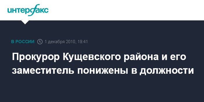 Москва. 1 декабря. INTERFAX.RU - Прокурор Кущевского района, а также один из его заместителей понижены в должности, еще один заместитель районного прокурора уволен, сообщила "Интерфаксу" официальный представитель Генпрокуратуры РФ Марина Гриднева.