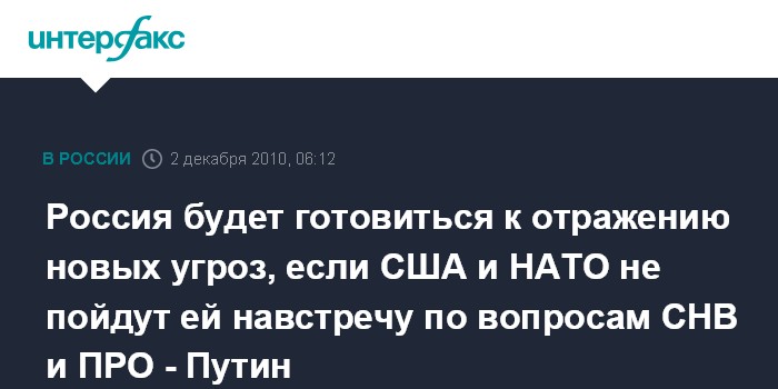 "Но если на наши предложения будут даны только отрицательные ответы и, более того, возле наших границ появится дополнительная угроза в виде нового варианта третьего позиционного района, то Россия просто обязана будет обеспечивать свою безопасность разными способами: устанавливать новые ударные комплексы против новых угроз, которые будут создаваться возле наших границ, создавать новые средства ракетно-ядерной техники", - подчеркнул российский премьер.