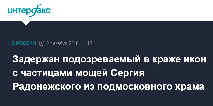 Москва. 2 декабря. INTERFAX.RU - В Московской области задержан один из подозреваемых в краже старинных икон преподобного Сергия Радонежского, его родителей и Илии Пророка из храма Святой Троицы в Мытищинском районе, сообщил "Интерфаксу" источник в правоохранительных органах в четверг.
