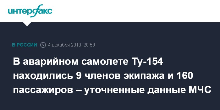 Москва. 4 декабря. ИНТЕРФАКС - По уточненным данным МЧС России, на борту лайнера, совершившего жесткую посадку в "Домодедово", находилось девять членов экипажа и 160 пассажиров.