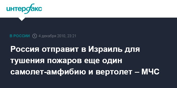"Планируется, что в воскресенье с подмосковного аэродрома "Раменское" в Израиль отправится самолет-амфибия Бе-200. Кроме того, завтра в Израиль прибудет и вертолет Ми-26, вылетевший накануне из Москвы. Он оборудован специальным водосливным устройством емкостью 15 тонн", - сказала она журналистам в субботу.