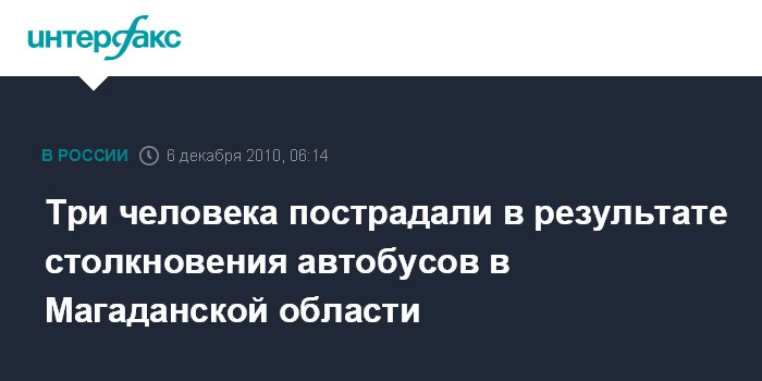 Магадан. 6 декабря. ИНТЕРФАКС - ДАЛЬНИЙ ВОСТОК - На седьмом километре Федеральной автотрассы "Колыма" (Магаданская область) столкнулись два пассажирских автобуса, пострадало трое человек.