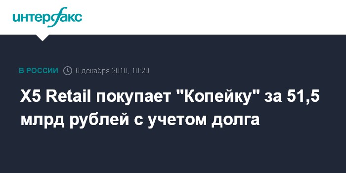 Сумма сделки составит 51,5 млрд рублей с учетом долга "Копейки" в 16,5 млрд рублей, говорится в сообщении X5.