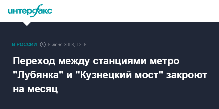 Москва. 9 июня. INTERFAX.RU - Режим работы перехода между станциями московского метрополитена "Кузнецкий мост" и "Лубянка" будет изменен с 18 июня по 17 июля 2008 года, сообщили "Интерфаксу" в пресс-службе подземки.