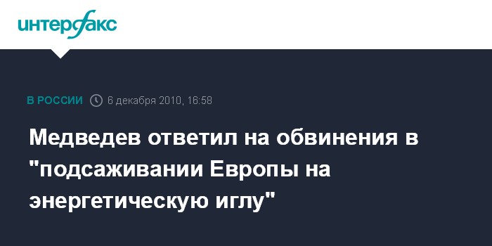 "Действительно, существуют мнения о политизированности практически всех российских энергетических проектов, желании России посадить на энергетическую иглу всю Европу, а потом использовать это для достижения политических преимуществ. Вы знаете нашу позицию. Мы считаем, что это абсолютная чушь", - заявил Медведев на пресс-конференции в Варшаве.
