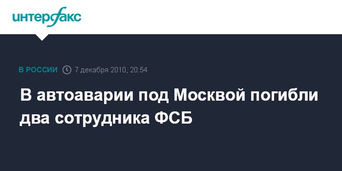 Москва. 7 декабря. INTERFAX.RU - В Подмосковье в результате ДТП погибли два сотрудника ФСБ, сообщил во вторник вечером "Интерфаксу" источник в правоохранительных органах.