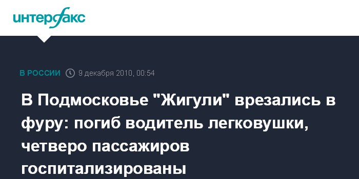 "В результате аварии водитель "Жигулей" погиб на месте, его четыре пассажира в крайне тяжелом состоянии отправлены в реанимацию", - сказал собеседник агентства.