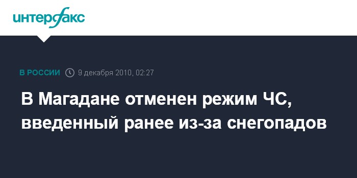 Магадан. 9 декабря. ИНТЕРФАКС-ДАЛЬНИЙ ВОСТОК - Режим ЧС, введенный в Магадане мэром областного центра 7 декабря из-за снегопадов, отменен в связи со стабилизацией обстановки, сообщает пресс-служба МЧС по региону в четверг.