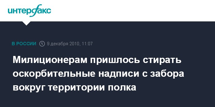 "Утром в среду на заборе второго отдельного полка милиции (ОПМ), который дислоцируется в Западном округе на 2-й Рябиновой улице, появились надписи оскорбительного содержания", - сказал собеседник агентства.