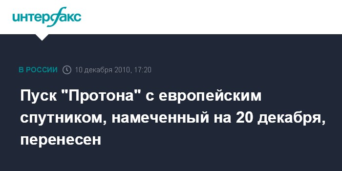 Москва. 10 декабря. INTERFAX.RU- Планировавшийся на 20 декабря пуск ракеты-носителя "Протон-М" с европейским космическим аппаратом KA-SAT отложен на более поздний срок, сообщил "Интерфаксу" в пятницу гендиректор Государственного космического научно-производственного центра им. Хруничева Владимир Нестеров.