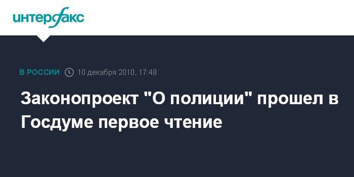 Москва. 10 декабря. ИНТЕРФАКС - Госдума в пятницу приняла в первом чтении президентский законопроект "О полиции", который представил депутатам глава МВД Рашид Нургалиев.