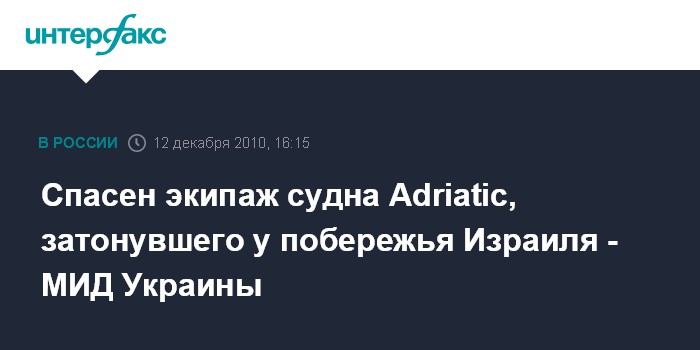 Киев. 12 декабря. INTERFAX.RU - Граждане Украины - члены экипажа затонувшего у берегов Израиля судна Adriatic - спасены и в госпитализации не нуждаются. Как сообщил в воскресенье пресс-секретарь Министерства иностранных дел Украины Александр Дикусаров, украинцы чувствуют себя хорошо и находятся на борту судна M.Greate (флаг Панамы). По информации дипломата, судно M.Greate прибудет в порт города Ашдод 12 декабря вечером, или 13 декабря утром.