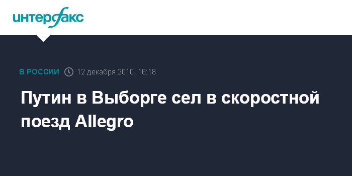Выборг. 12 декабря. INTERFAX.RU - Премьер-министр РФ Владимир Путин сел в Выборге в следующий из Хельсинки скоростной поезд Allegro и вместе с президентом Финляндии Тарьей Халонен направился в Санкт-Петербургю Премьер-министр РФ встретил Т.Халонен на перроне и подарил ей цветы. Он отметил, что в России с нетерпением ждали реализации этого проекта, и он рад, что "все получилось".