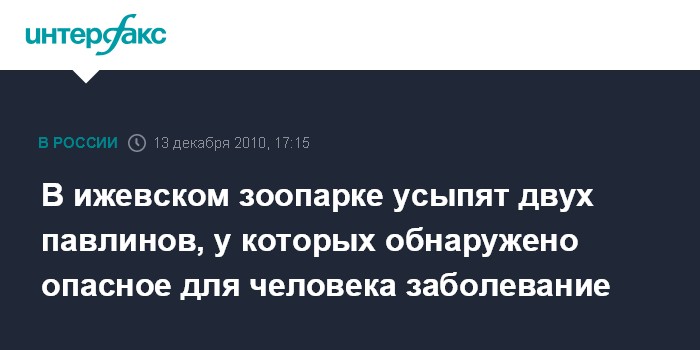 Ижевск/Казань. 13 декабря. INTERFAX.RU - Ветеринары выявили орнитоз у двух зеленых павлинов, поступивших в карантинное отделение зоологического парка Удмуртии (Ижевск) из казанского зооботсада.