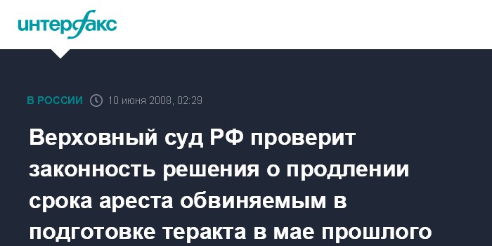 Москва. 10 июня. ИНТЕРФАКС - Верховный суд РФ рассмотрит жалобы защиты на продление срока ареста трем фигурантам дела о подготовке теракта в Москве на майские праздники в 2007 году.
