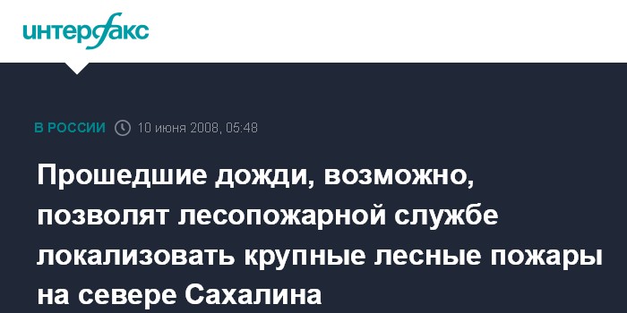 Как сообщил агентству "Интерфакс-Дальний Восток" во вторник начальник Сахалинской базы авиаохраны лесов Николай Копейкин, сегодня в Ногликском районе прошли дожди, что, возможно, позволит локализовать пожары.
