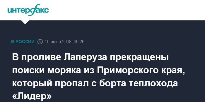 Южно-Сахалинск. 10 июня. ИНТЕРФАКС-ДАЛЬНИЙ ВОСТОК - В проливе Лаперуза (юг Сахалина) во вторник утром прекращены поиски второго помощника капитана теплохода "Лидер", принадлежащего одной из компаний Приморского края.