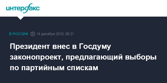Москва. 14 декабря. INTERFAX.RU - Президент России Дмитрий Медведев в соответствии внес в Госдуму проект федерального закона "О внесении изменений в статью 35 закона "Об основных гарантиях избирательных прав и права на участие в референдуме граждан РФ" и в федеральный закон "Об общих принципах организации местного самоуправления" в связи с применением пропорциональной избирательной системы на выборах депутатов представительных органов муниципальных районов и городских округов" .