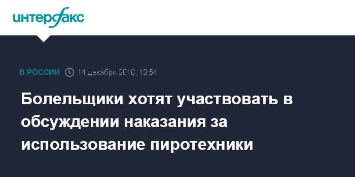 Москва. 14 декабря. INTERFAX.RU - Футбольных болельщиков следует привлекать к обсуждению вопроса возможного ужесточения наказания за использование пиротехники на стадионах и во время массовых мероприятий, заявил "Интерфаксу" лидер движения болельщиков "Фратрия" Евгений Селеменев.