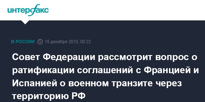 Сенаторам также предстоит ратифицировать соглашение между правительством России и Франции о транзите военного имущества и персонала через территорию РФ. Ратификация этого документа вызвана участием вооруженных сил Франции в усилиях по стабилизации ситуации в Афганистане.