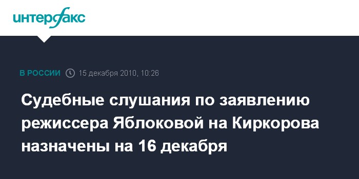 "Мировым судьей 417-го судебного участка заявление Яблоковой было принято к производству. Слушания назначены на 16 декабря", - сообщила "Интерфаксу" в среду пресс-секретарь Пресненского суда Ольга Сутяпова.