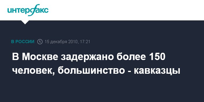 Москва. 15 декабря. INTERFAX.RU - Более 150 человек задержаны в Москве за противоправные действия, большинство из них - выходцы из кавказских республик, заявил "Интерфаксу" официальный представитель ГУВД Москвы Виктор Бирюков.