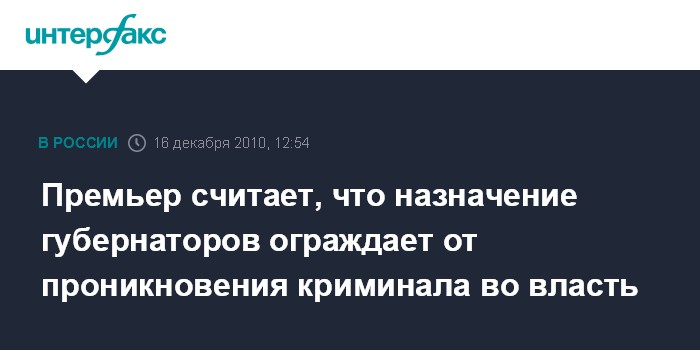 Москва. 16 декабря. INTERFAX.RU - Премьер-министр РФ Владимир Путин считает, что существующий порядок назначения губернаторов на должность ограждает общество от проникновения во власть криминала.