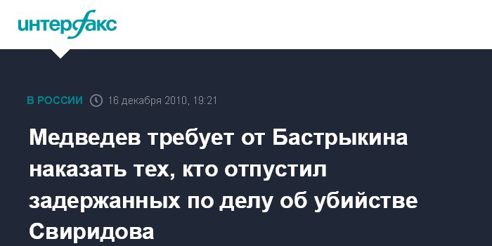 Рязань. 16 декабря. INTERFAX.RU - Президент РФ Дмитрий Медведев велел главе Следственного комитета Александру Бастрыкину разобраться в ситуации, когда были отпущены задержанные по подозрению в причастности к убийству болельщика Егора Свиридова, и наказать виновных.
