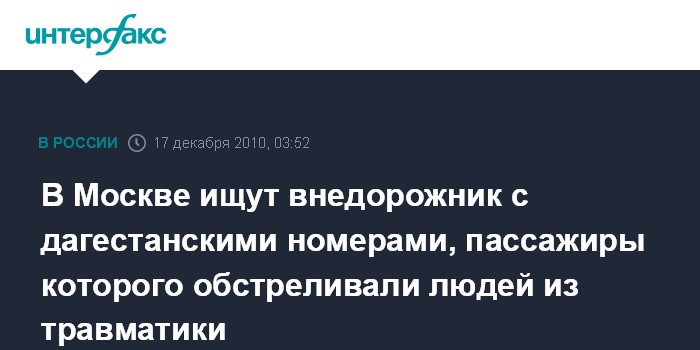 Москва. 17 декабря ИНТЕРФАКС - В столице разыскивают внедорожник с дагестанскими номерами, пассажиры которого обстреляли нескольких человек из травматического оружия, сообщил "Интерфаксу" в пятницу источник в правоохранительных органах.