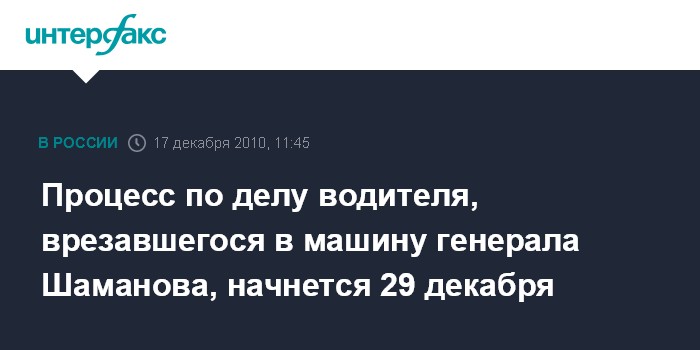 Тула. 17 декабря. INTERFAX.RU - Предварительные слушания по уголовному делу в отношении водителя, обвиняемого в совершении ДТП с машиной командующего ВДВ генерал-лейтенанта Владимира Шаманова, назначены на 29 декабря, сообщила "Интерфаксу" пресс-секретарь управления судебного департамента Тульской области Ольга Дячук.