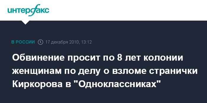 Москва. 17 декабря. INTERFAX.RU - Гособвинитель потребовал у суда назначить по восемь лет колонии Нине Юровой и Вере Японцевой, обвиняемых во взломе личной страницы певца Филиппа Киркорова на сайте "Одноклассники.ру", а также в мошенничестве.
