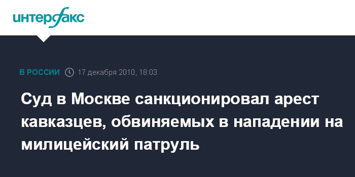 Москва. 17 декабря. INTERFAX.RU - Никулинский суд Москвы арестовал пятерых выходцев с Кавказа, которых обвиняют в том, что 15 декабря они напали на патруль милиционеров у станции метро "Юго-Западная" напали на милиционеров.