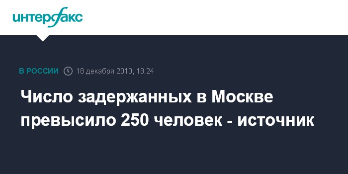 Москва. 18 декабря. INTERFAX.RU - Общее количество задержанных за попытки провести несанкционированные акции в разных районах Москвы в субботу составило более 250 человек, сообщил "Интерфаксу" источник в правоохранительных органах. В числе задержанных как лица кавказской национальности, так и радикально настроенная русская молодежь. "Около 130 человек задержаны на Манежной площади, более 70 - в Останкинском парке, десятки в других районах Москвы", - добавил собеседник агентства.
