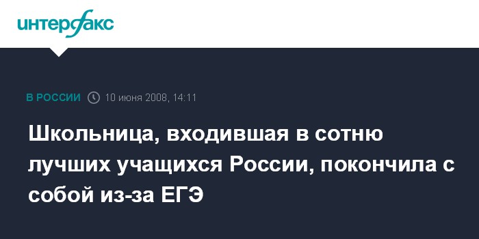 Москва. 10 июня. INTERFAX.RU - В деревне Березник Вологодской области 15-летняя школьница покончила жизнь самоубийством после того, как обнаружила ошибку, допущенную ее при сдаче единого муниципального экзамена по математике. Как сообщает областная "служба спасения 01", девочка была обнаружена в летней кухне, где повесилась после сдачи экзамена. Губернаторская стипендиатка Полина Белова входила в список ста лучших учащихся России.