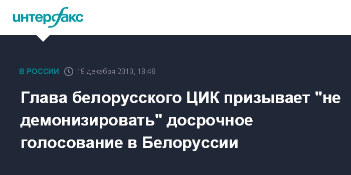 Минск. 19 декабря. INTERFAX.RU - Председатель ЦИК Белоруссии Лидия Ермошина считает досрочное голосование нормальной процедурой и призывает не "демонизировать" его.