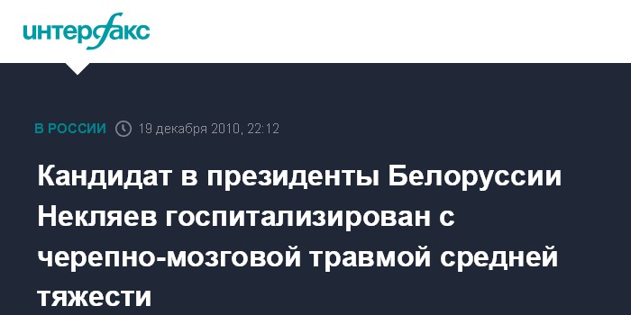 Минск. 19 декабря. ИНТЕРФАКС-ЗАПАД - Пострадавший в результате разгона колонны демонстрантов кандидат в президенты Белоруссии Владимир Некляев госпитализирован с диагнозом черепно-мозговая травма средней тяжести, сообщила агентству "Интерфакс-Запад" пресс-секретарь кандидата Юлия Рымашевская.