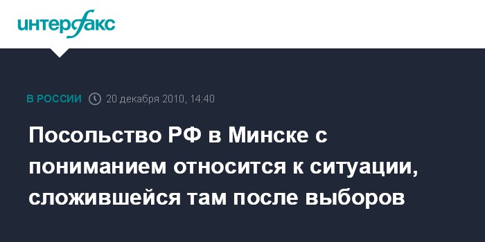 Минск. 20 декабря. INTERFAX.RU - Посольство России в Минске с пониманием относится к ситуации, которая сложилась в белорусской столице вечером 19 декабря, заявил агентству "Интерфакс" в понедельник советник российской дипмиссии Вадим Гусев.
