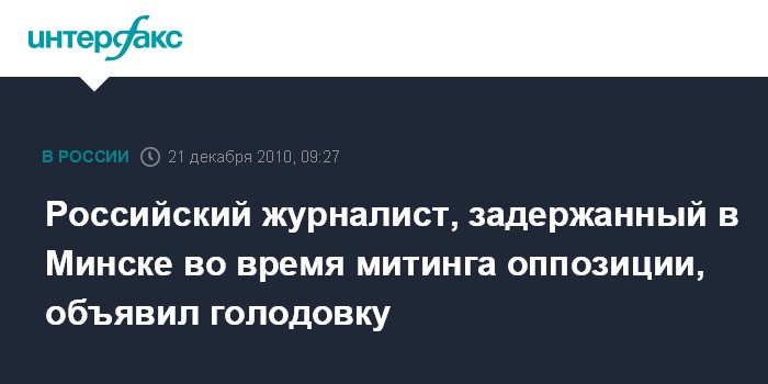 Москва. 21 декабря. INTERFAX.RU - Журналист петербургского издания, задержанный в Минске при разгоне митинга оппозиции, объявил голодовку с требованием встречи с представителями посольства РФ, сообщает радиостанция "Эхо Москвы" в понедельник.