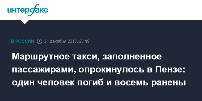 Пенза. 21 декабря. ИНТЕРФАКС-ПОВОЛЖЬЕ - Один человек погиб и, по меньшей мере, восемь получили травмы различной степени тяжести в результате ДТП с участием маршрутного такси в Пензе.