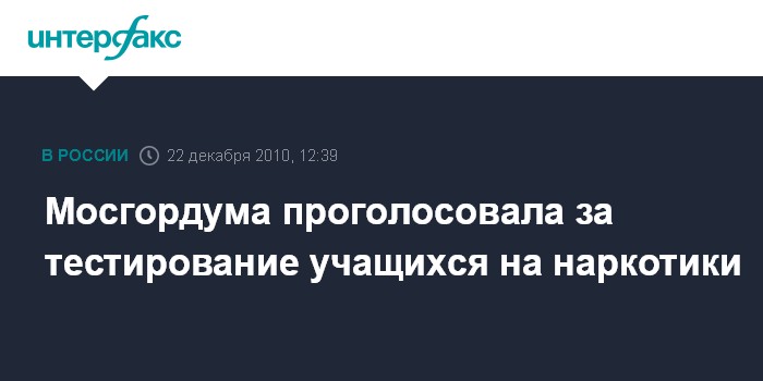 Москва. 22 декабря. INTERFAX.RU - Депутаты Мосгордумы одобрили в среду в первом чтении законодательную инициативу о поправках в федеральное законодательство, предусматривающих тестирование учащихся на потребление наркотических веществ.