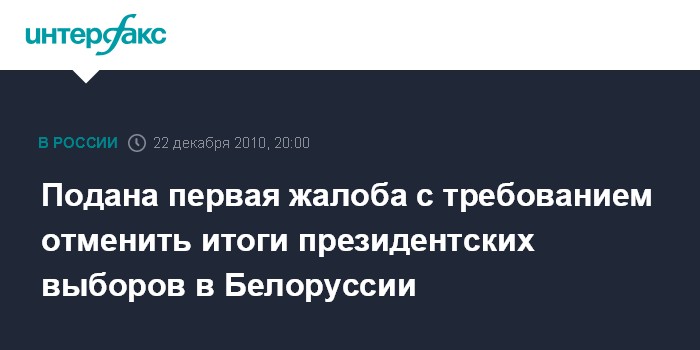 Минск. 22 декабря. INTERFAX.RU - В Центризбирком Белоруссии поступила жалоба от кандидата в президенты Григория Костусева с требованием признать итоги президентских выборов недействительными, сообщил агентству "Интерфакс-Запад" в среду секретарь ЦИК Николай Лозовик.