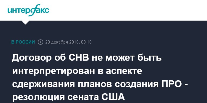 Вашингтон. 23 декабря. ИНТЕРФАКС - Резолюция сената США о ратификации договора об СНВ с Россией содержит поправку о том, что данный договор не может быть интерпретирован как средство сдерживания планов создания американской ПРО.